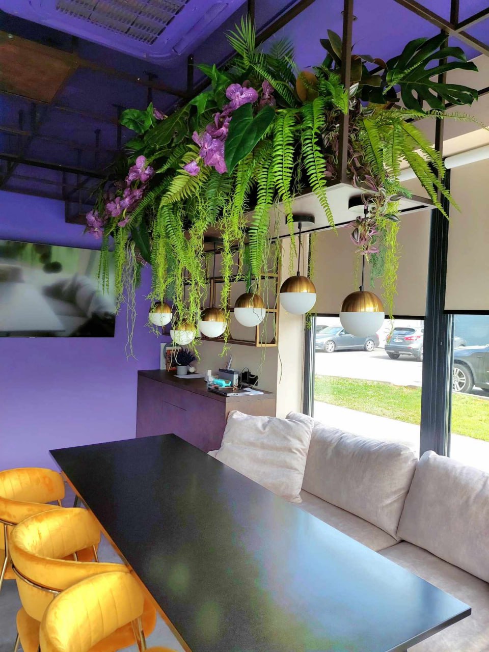 Several types of hanging plants + flowers