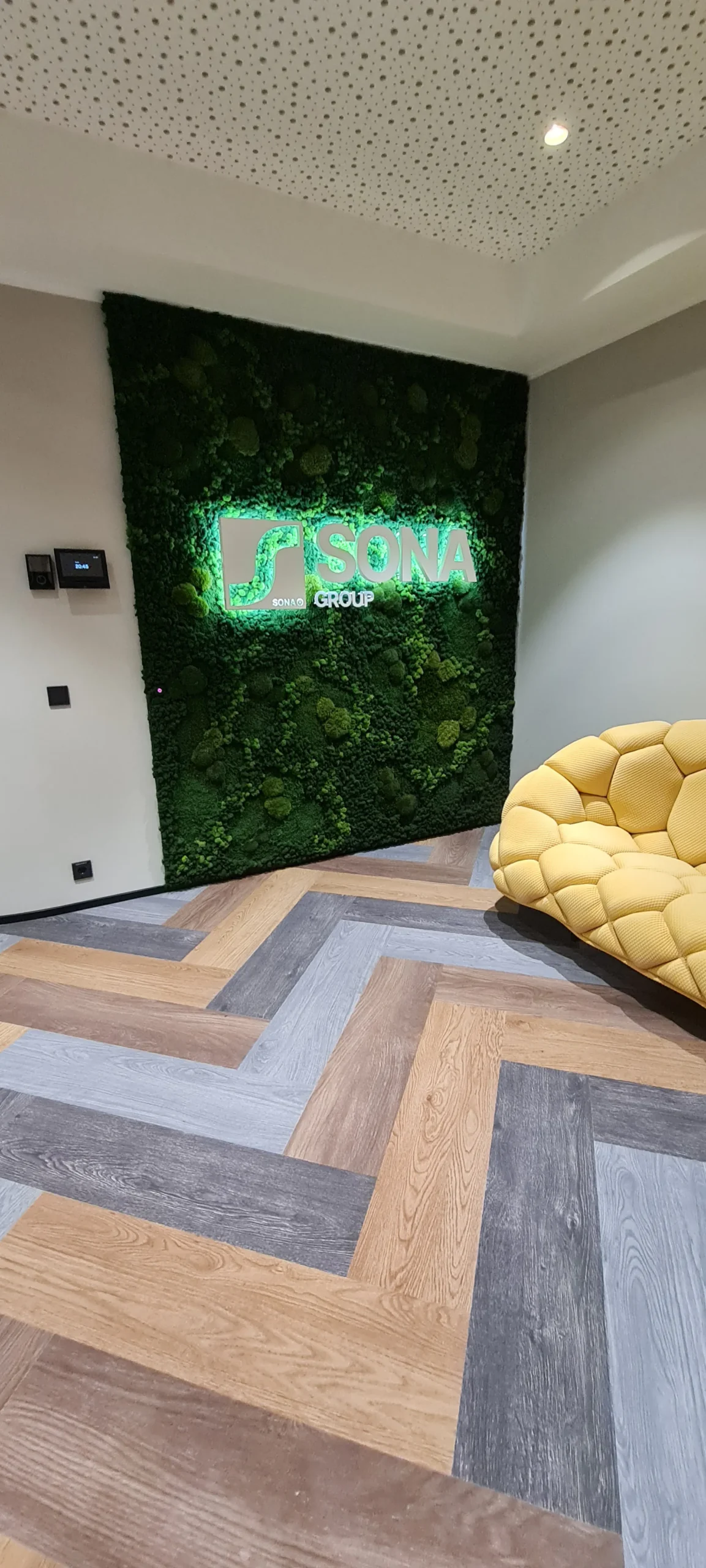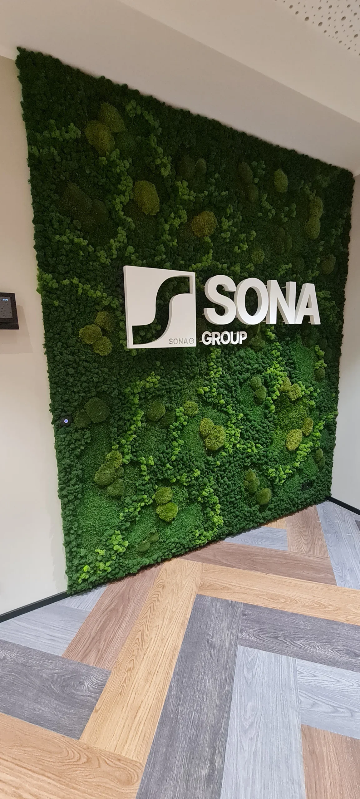 Kasutame 3 tüüpi sammalt: samblapallid, madal sammal, põdrasammal. Sammal hooldust ei vaja, alternatiivne lahendus roheluse lisamiseks interjööri. Logo on valmistatud vineerist ja värvitud mis tahes värviga vastavalt RAL kataloogile.